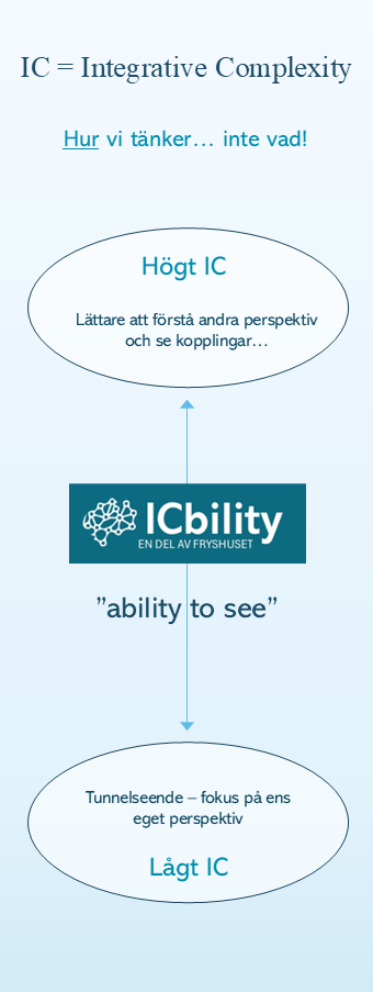 Högt IC = Ett nyanserat och komplext tänkande. Möjlighet att se flera sidor av en fråga, fler valmöjligheter, olika förklaringar och rimligheten i andra personers perspektiv inklusive interaktionen mellan dessa, även när vi inte delar samma åsikt.